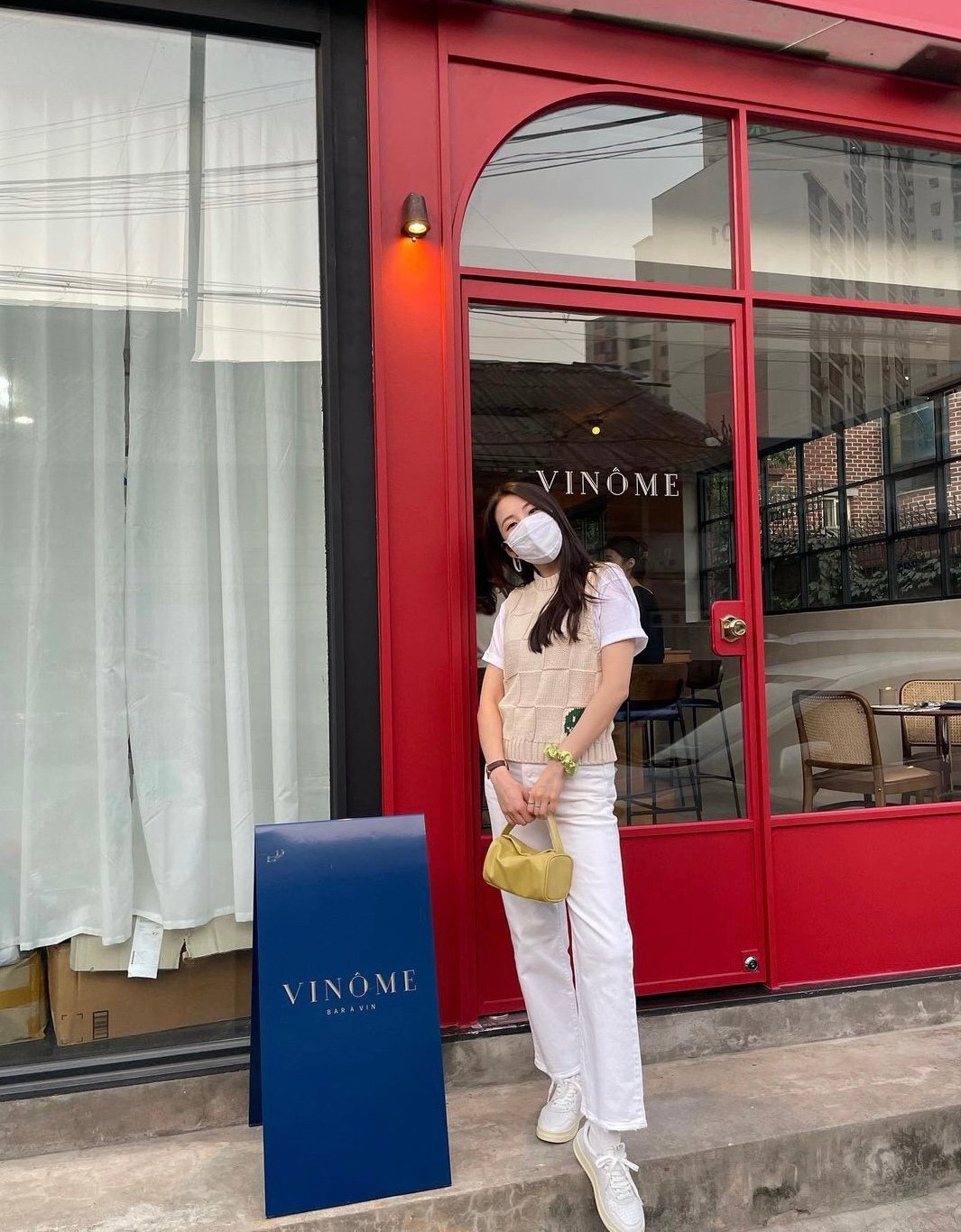 아이보리 니트조끼로 포근함을 더했습니다.